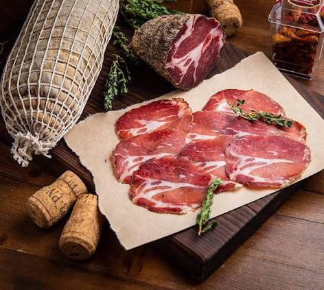 «Коппа» — традиционный сыровяленный итальянский деликатес из отборной свиной шейки. Ярко-красный цвет и мраморно-белые прожилки на срезе создают поистине завораживающее зрелище. Благодаря долгой ферментации мясо приобретает пикантный вкус, легкую остроту. Внутри Коппа пронизана тонкой сеточкой жира, из-за чего она буквально тает во рту, оставляя послевкусие мускатного ореха. Коппу едят в качестве закуски самостоятельно или в составе мясной тарелки. Превосходно подходит для приготовления брускет и пиццы. Отлично сочетается со свежими овощами и зеленью (руккола, шпинат). Из сыров наиболее подходящим вариантом будет Горгонзолла или любой другой сыр с голубой плесенью. В Италии коппа как правило сопровождает первые блюда (различные супы) на основе бобовых. Из алкогольных напитков выбор лучше остановить на белом вине.
